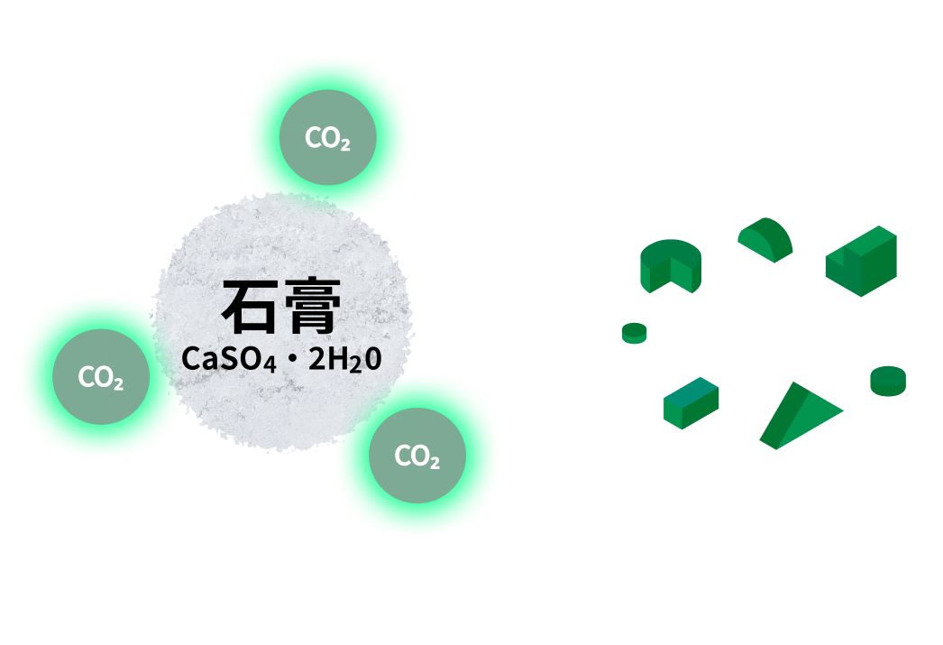 廃石膏ボードを粉砕した粉と、CO₂を反応させることで、