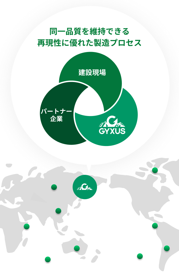 フランチャイズモデルの確立を目指して GYXUSは、生産体制を標準化・モジュール化し、フランチャイズモデルとして展開することで、日本国内外へ循環インフラを拡大します。パートナー企業と連携しながら、「石膏ボードを地球に埋めない世界」を実装する。